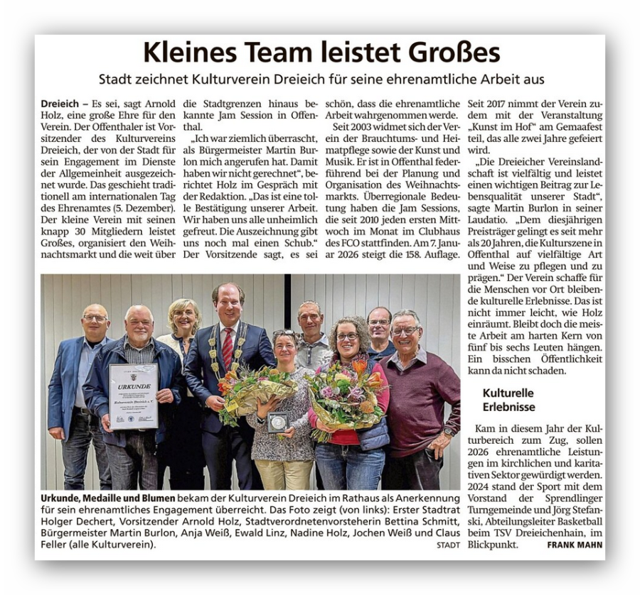 Das Team des Kulturverein Dreieich e.V. wurde am Tag des Ehrenamts von der Stadt Dreieich mit dem Ehrenamtspreis 2025 im Bereich Kultur ausgezeichnet.
